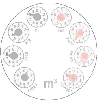 2、指針式水表讀數(shù):指針式水表是十進(jìn)位累進(jìn)計(jì)數(shù),以家庭用水表為例水表指示數(shù)有個(gè)、十、百、千四位數(shù)(黑色指針),計(jì)算單位為立方米(噸),立方米以下有1/10、1/100、1/1000、1/10000四位數(shù)(紅色指針),如下圖: